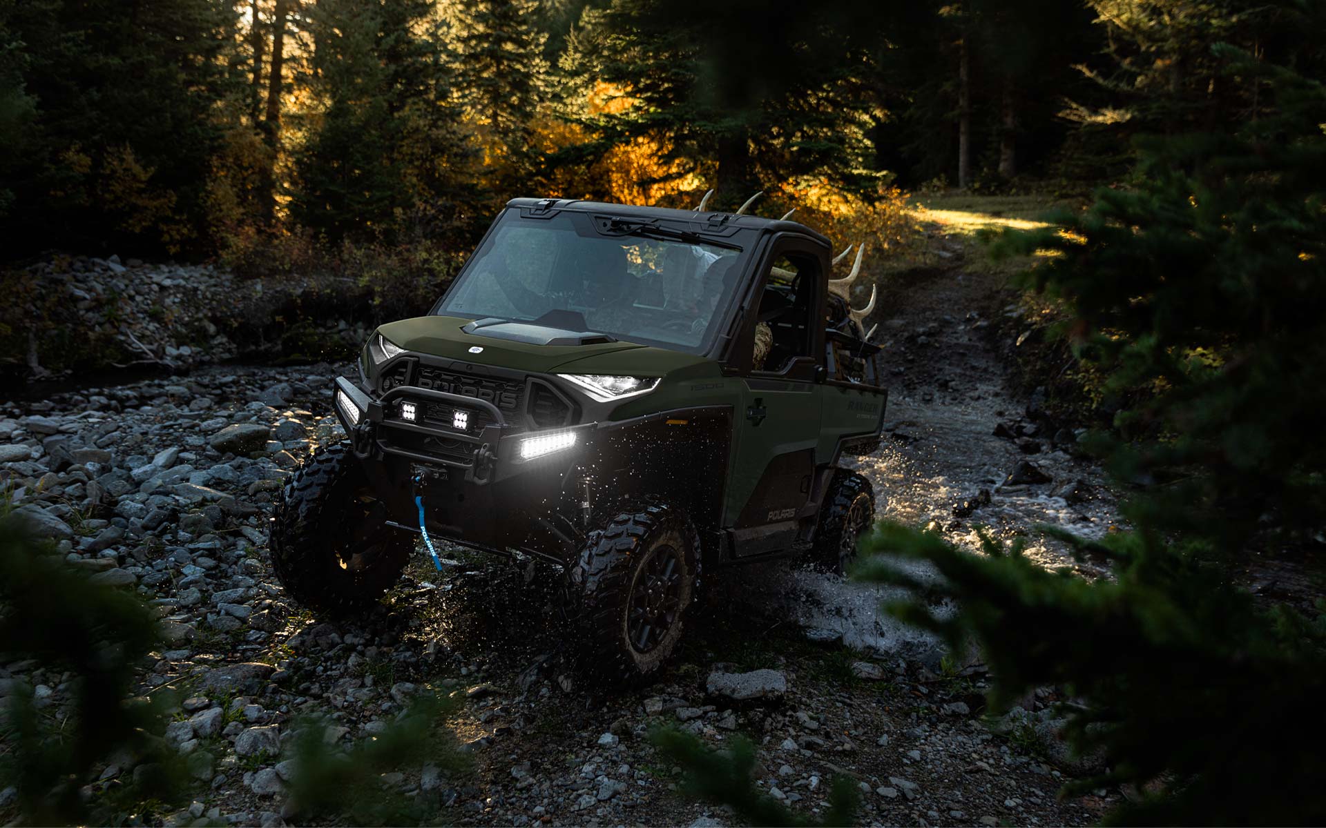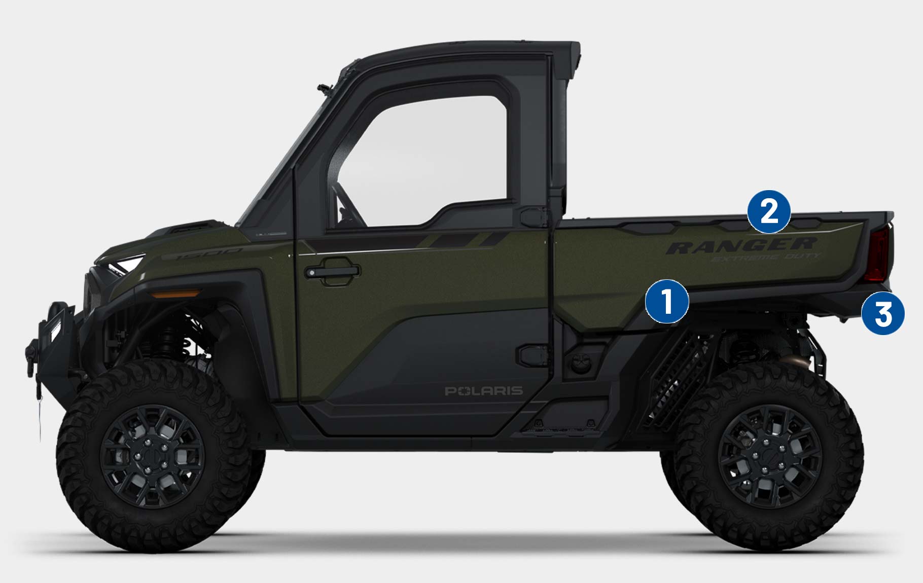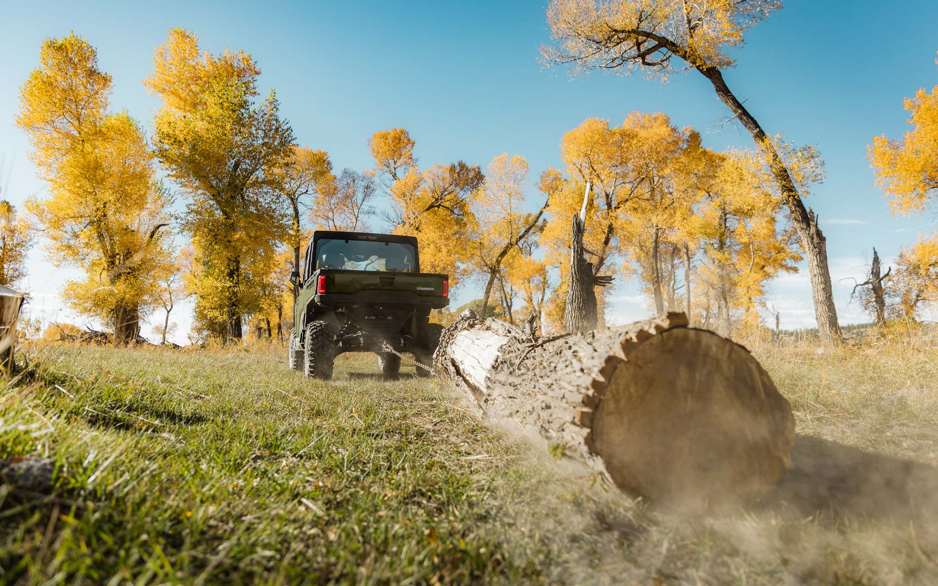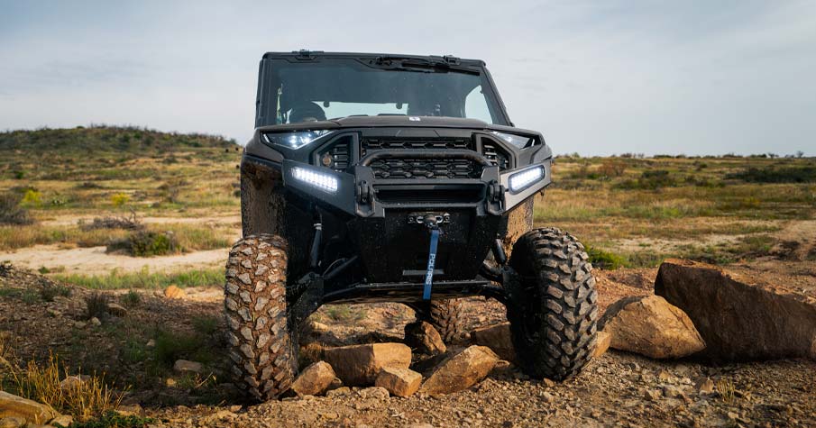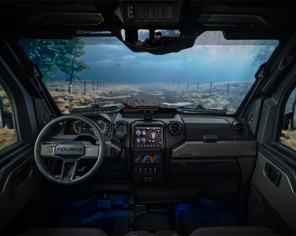 - Factory-installed cab system with powered doors, roof, tip-out glass windshield, glass rear panel, rearview mirror, windshield wiper/washer, and sound insulation materials, Factory-installed heat, AC, defrost, recirculation with 5 different airflow settings, Speed limiting controlled in RIDE COMMAND, 140-amp charging system, Polaris PULSE electrical system (3-position hood and 3-position roof), USB charger, trickle charger, 12-volt accessory outlet, battery trickle-charging port, Pro Series 2,722 kg Winch with synthetic rope, Auto Stop, wireless remote and Rapid Rope Recovery, Large steel bumper, full-coverage skid plate, bumper D-rings, and top bar